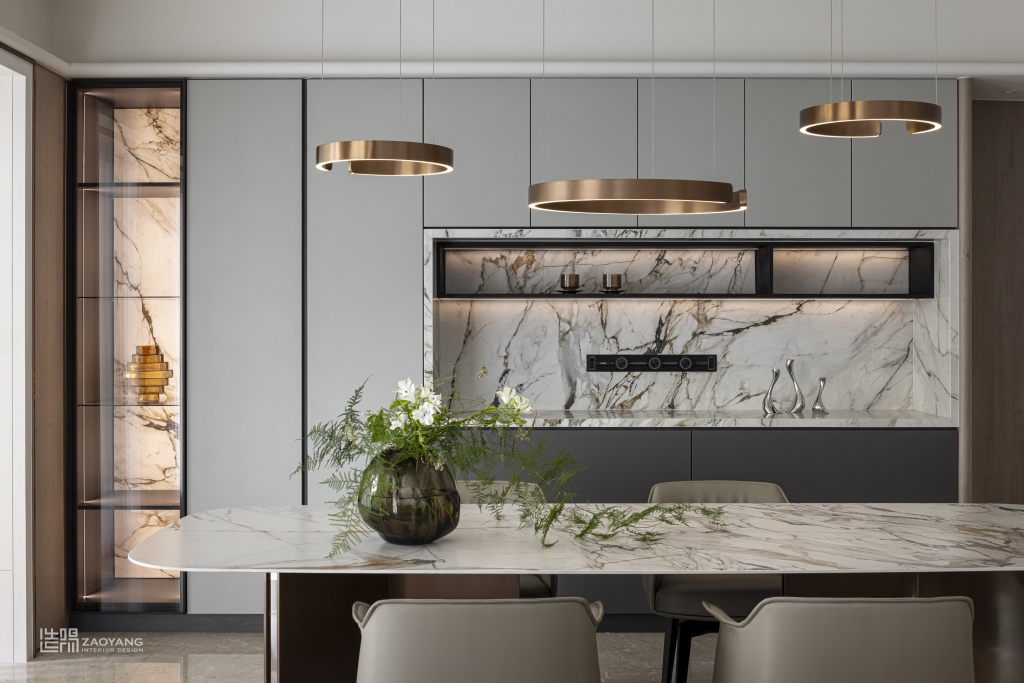 走進公共空間,開放式格局帶來寬闊而大氣的感受,視線順著延伸至戶外陽台,四季更替的綠意與灑落的陽光,共同為室內注入生機與光輝。客廳中,設計師選用木質的溫潤搭配金屬的現代感,細膩的大理石肌理隨著自然的脈絡流動,與簡約低調的家具相輝映,將來自自然的元素揉入空間設計,營造出穩重又不失雅緻的氛圍。每一處細節,都充滿著設計師的溫度與體貼,反映出對生活無微不至的用心。
