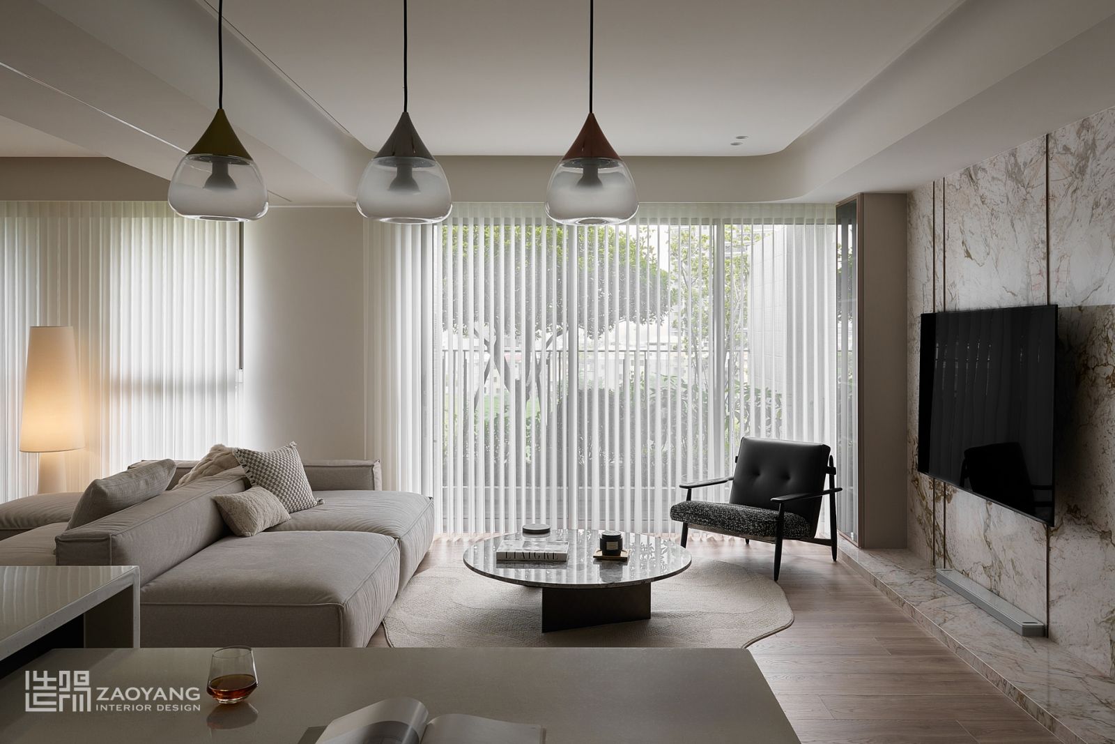 以開放式空間設計為核心,將客廳、書房、餐廚無縫串連,透過大理石紋理、線性光源與中性色彩交織出柔和靜謐的氛圍,同時保有流動與互動感。玄關設計採用「隔而不斷」的屏風手法,賦予儀式感的空間轉場,也提升整體空間的尺度與層次。
